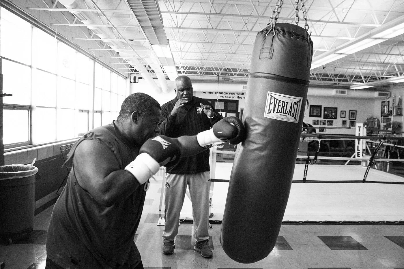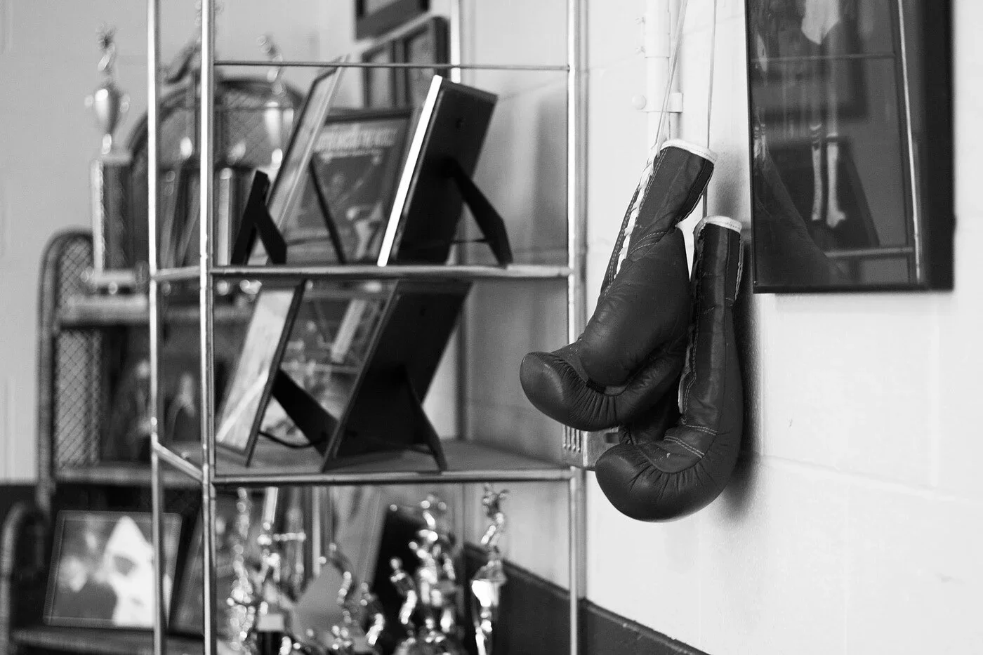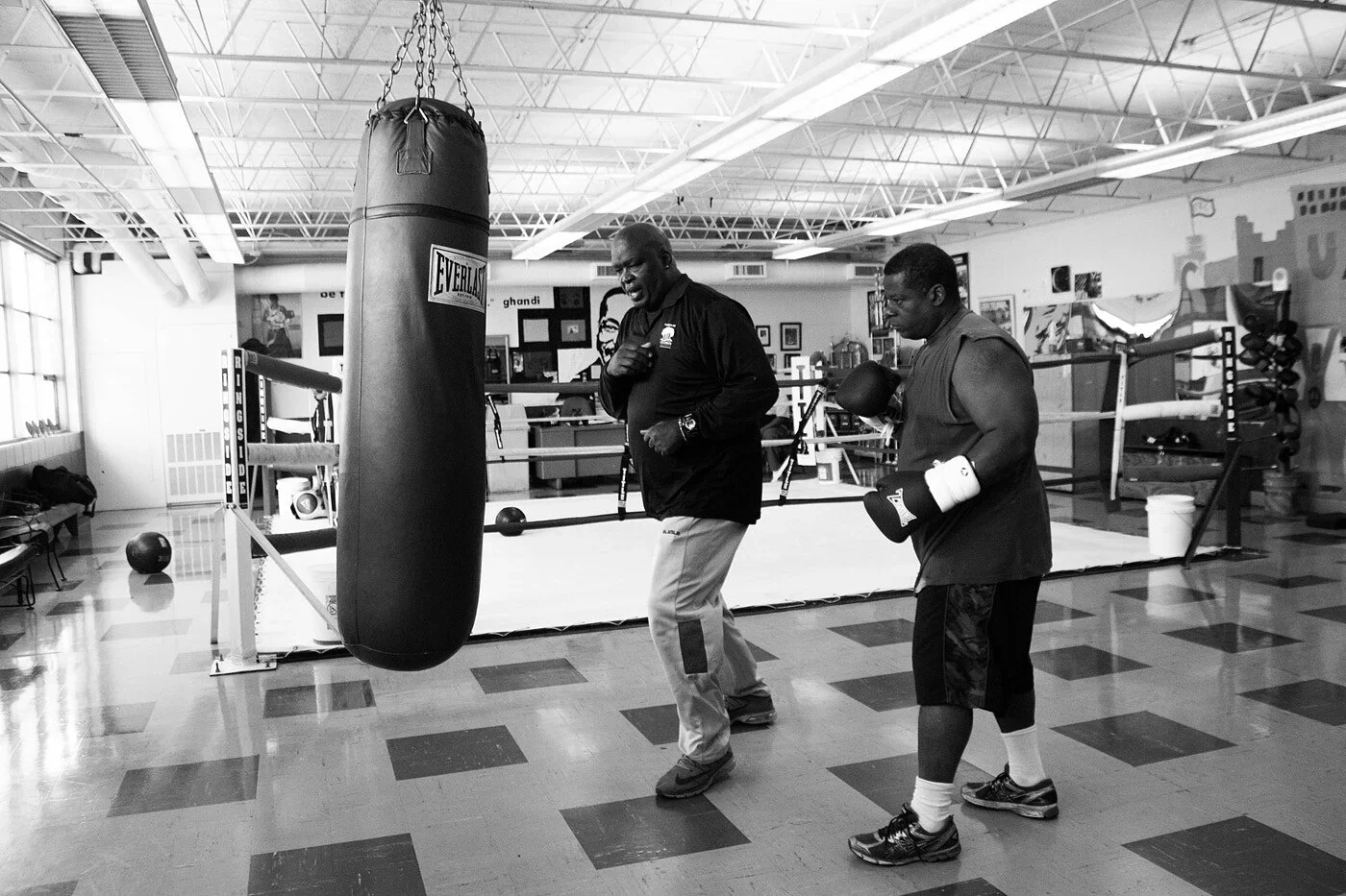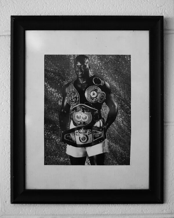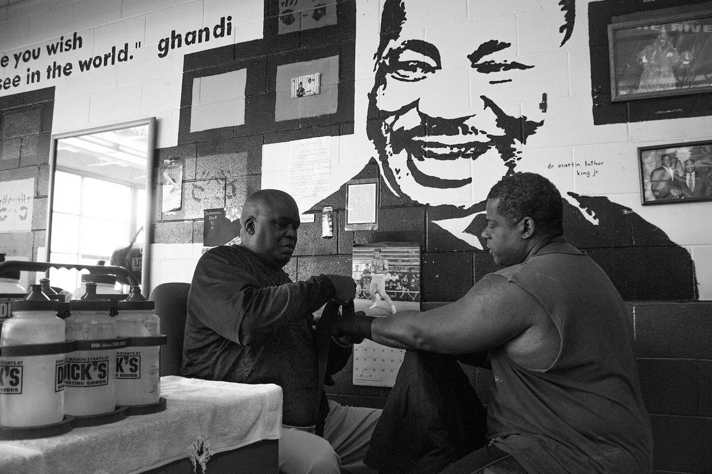 As you look around the gym, a myriad of trophies, accolades, and promo posters that he has collected over the years jumps out. Photographs of Douglas with Muhammad Ali are scattered throughout the shelves that hold the gold trophies. Behind him, murals of Gandhi and Martin Luther King Jr. have been painted on the walls, towering above as he surveys the room.